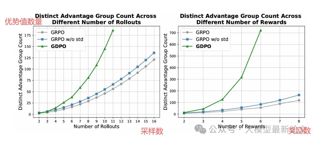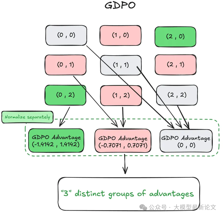 回到之前的例子,GDPO 将会产生 3 个不同的优势组,更准确地区分了不同轨迹的表现水平