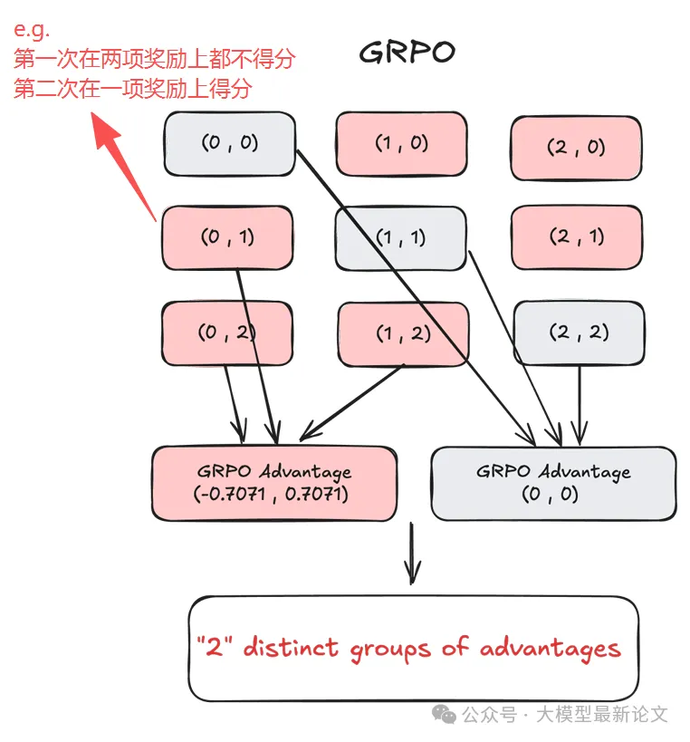 这就出问题了:直觉上 (0,2) 应该比 (0,1) 产生更强的学习信号(因为前者拿到了两个奖励,后者只有一个),但 GRPO 让它们完全相同!