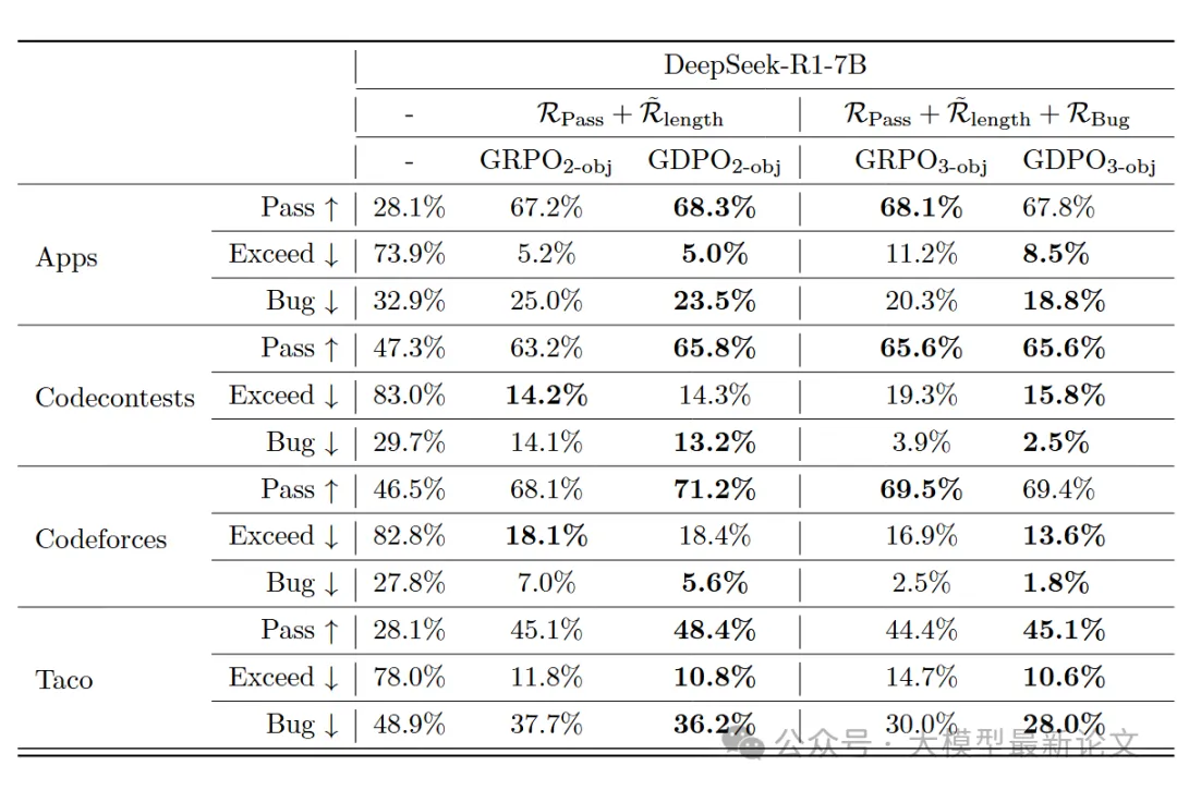在具有三项约束(准确率、长度约束、缺陷率)的代码推理场景上,GDPO 在多个维度上都优于 GRPO