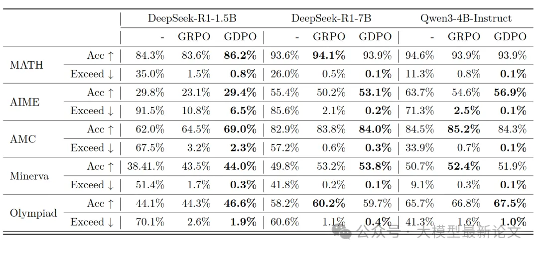 - 最难的 AIME 任务上,GDPO 优势最明显(+6.3% vs GRPO)