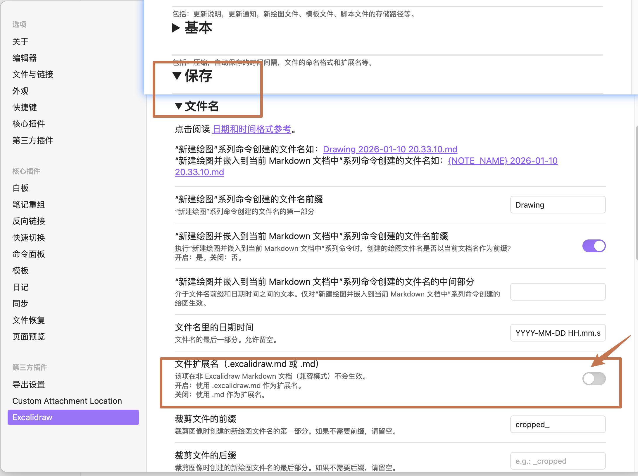 1、关闭使用.excalidraw.md作为扩展名,改为使用.md为扩展名