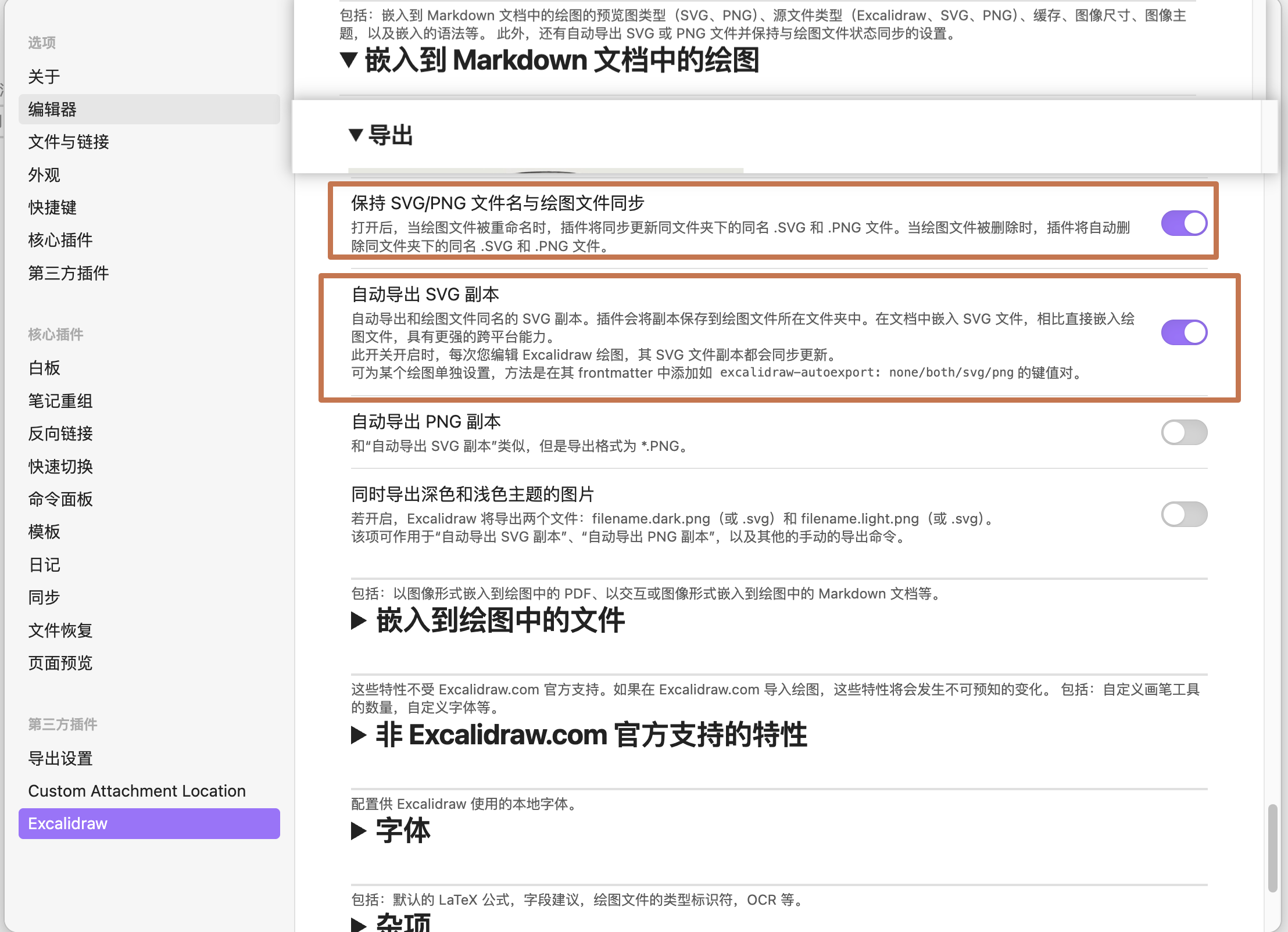 "自动导出SVG"配置开启是为了实现在md中添加Excalidraw中绘制的内容