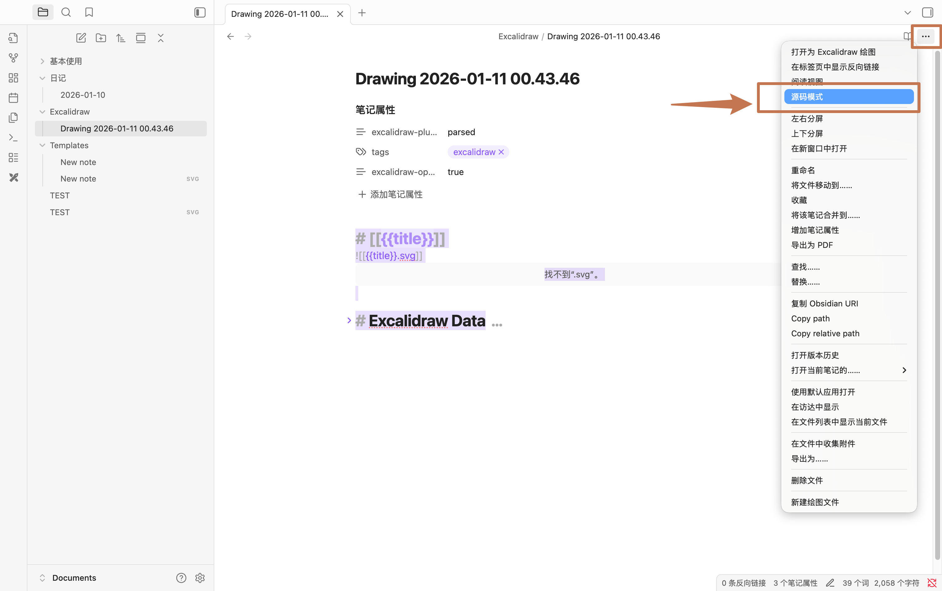 绘图切换到源码模式-〉复制粘贴内容到md文件中即可(注意:笔记属性粘贴在最上方,Excalidraw Data粘贴在md内容后面)