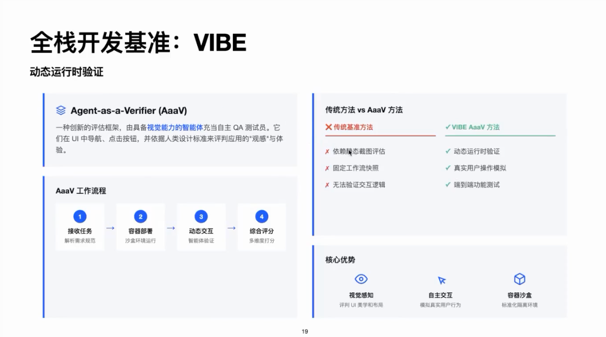 最后是在多脚手架上做拒绝采样及 RL。此外,还会利用 Agent as a Verifier 来做 Reward 校验。原因是在前端等场景,仅给出一个 Rubric 很难根据静态代码做判断。我们会让模型在沙盒环境中把项目完整部署起来,通过 Playwright 等工具与界面交互,根据交互后的状态变化对照 Rubric 打分。