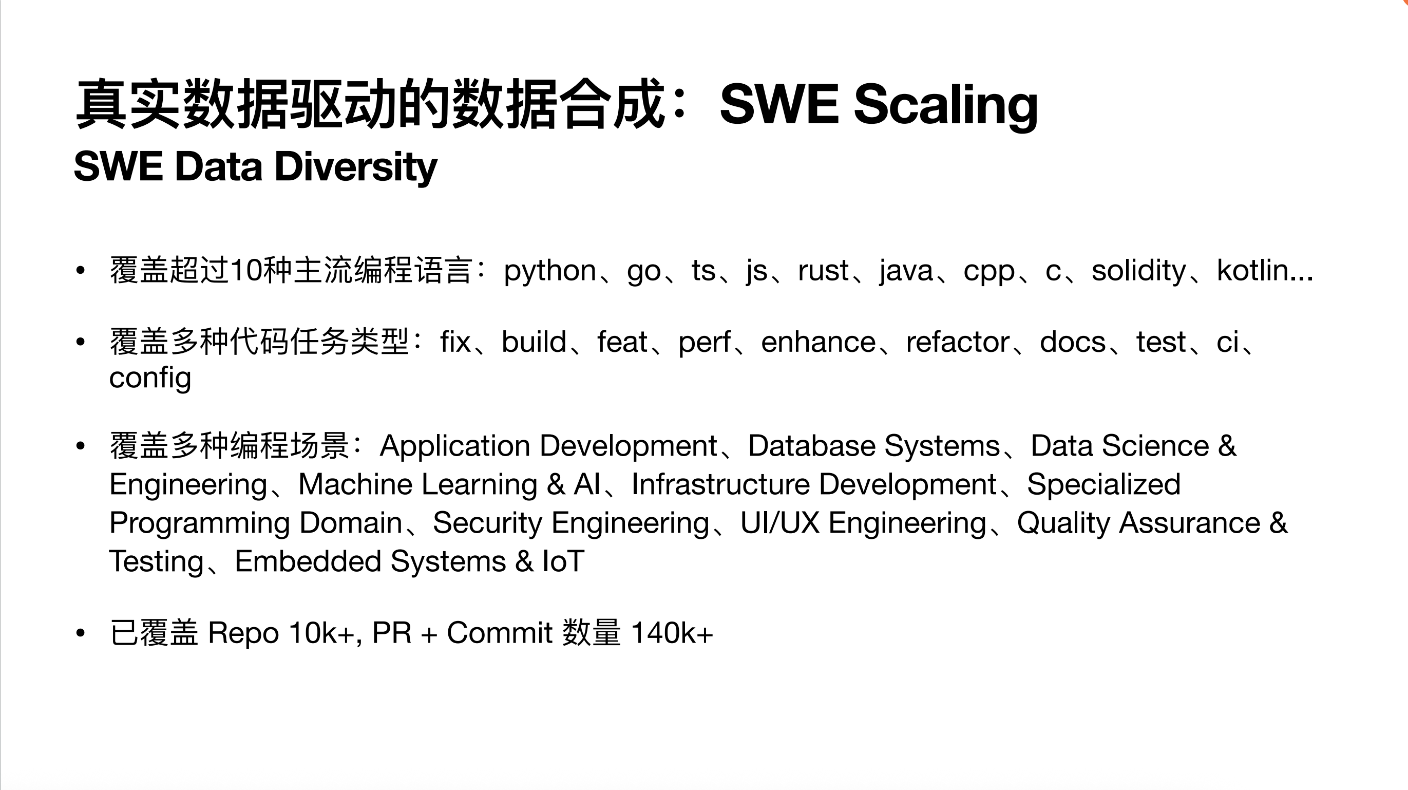 首先是一个比较核心的东西,就是整个软件工程场景下的数据 Scaling。这里有一个非常核心的点,就是要利用好 GitHub 这样一个非常庞大且结构化的数据来源,去合成各种各样 Verifiable(可校验)的任务。有了这些任务之后,无论是去做拒绝采样、构建 SFT 数据,还是去做 RL,都会有非常好的数据基础。