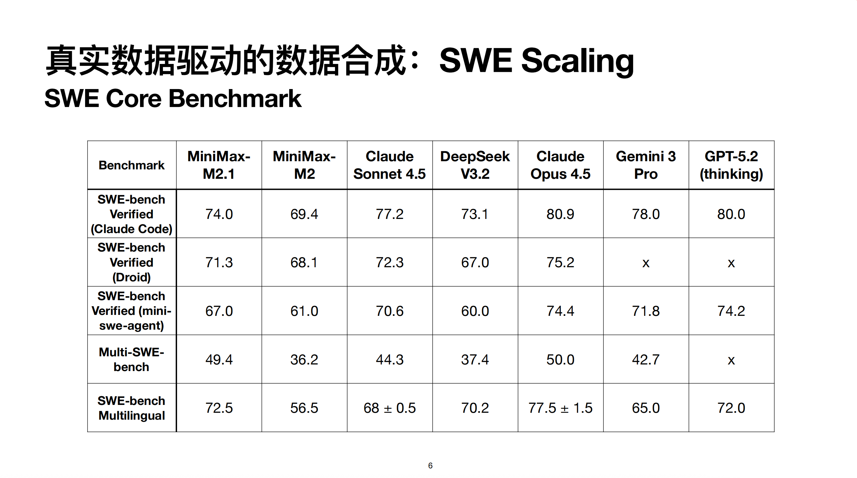 最后是在几个 SWE 类核心榜单上的指标。对比 M2.1 和 M2,尤其在 Multi-SWE、SWE-bench 等多语言场景上,由于做了更充分的 Scaling,有显著提升。