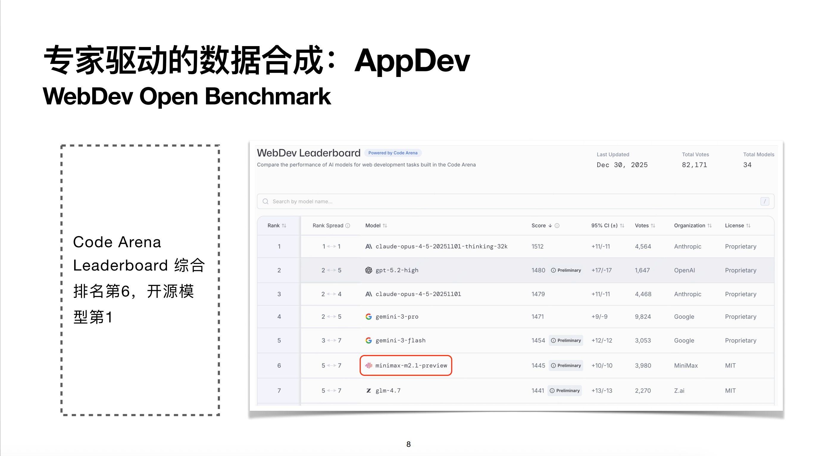 整个 AppDev 领域目前开源榜单中较受关注的是 Hot Arena,我们在上面排行开源模型第一。关于 App 我们也有自建榜单 VIBE Arena,后面会展开介绍。