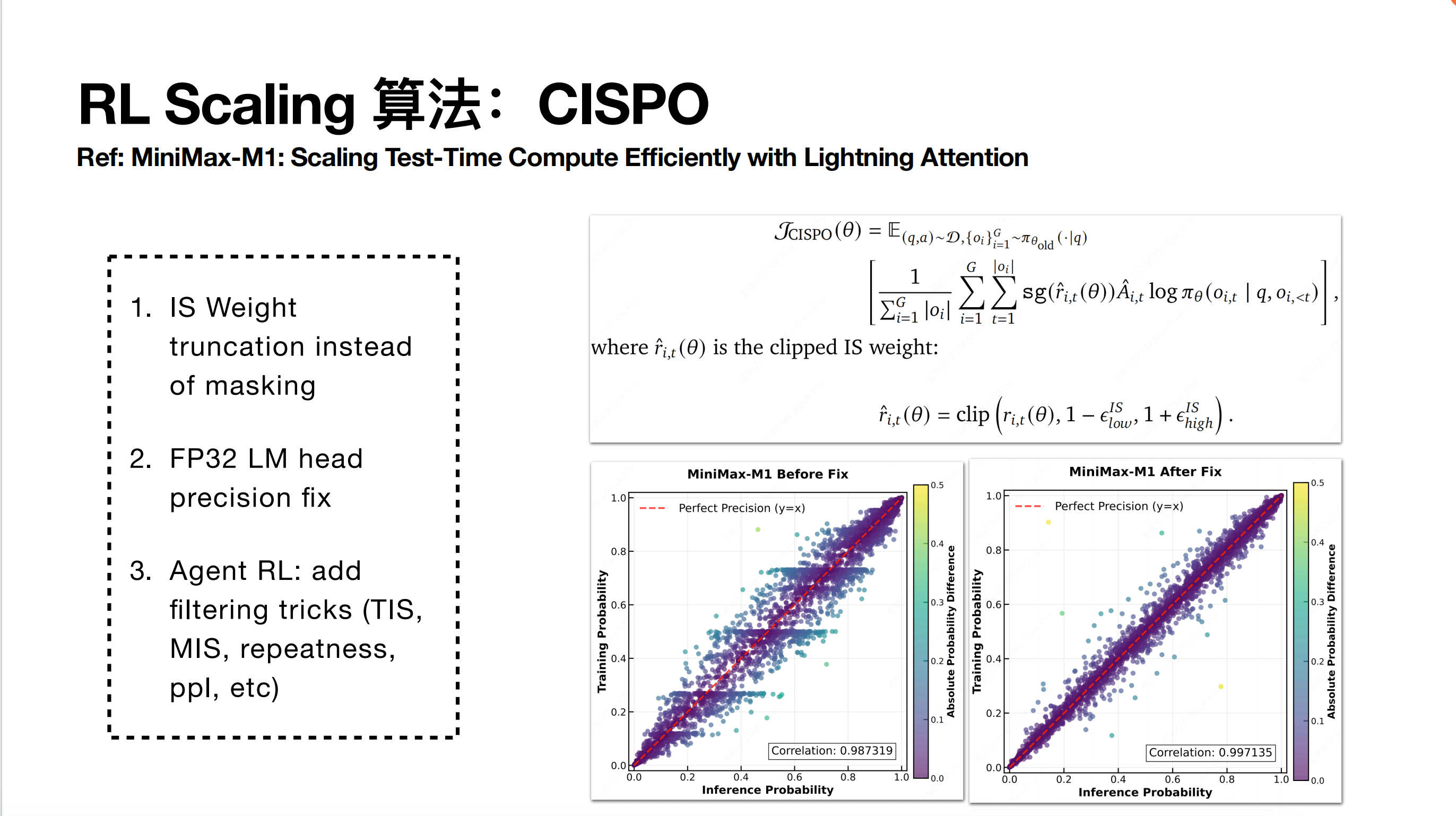算法方面,其实我们截止到 M2.1 时代,整个 RL(强化学习)算法的核心仍然沿用了原先在 MiniMax M1 论文中所提出的 CISP 算法。当时在 M1 里面提到了两个比较核心的点:一个是 CISP 本身的重要性采样截断(Importance Sampling Truncation)设计,另一个是当时针对 FP32 精度做的修复。