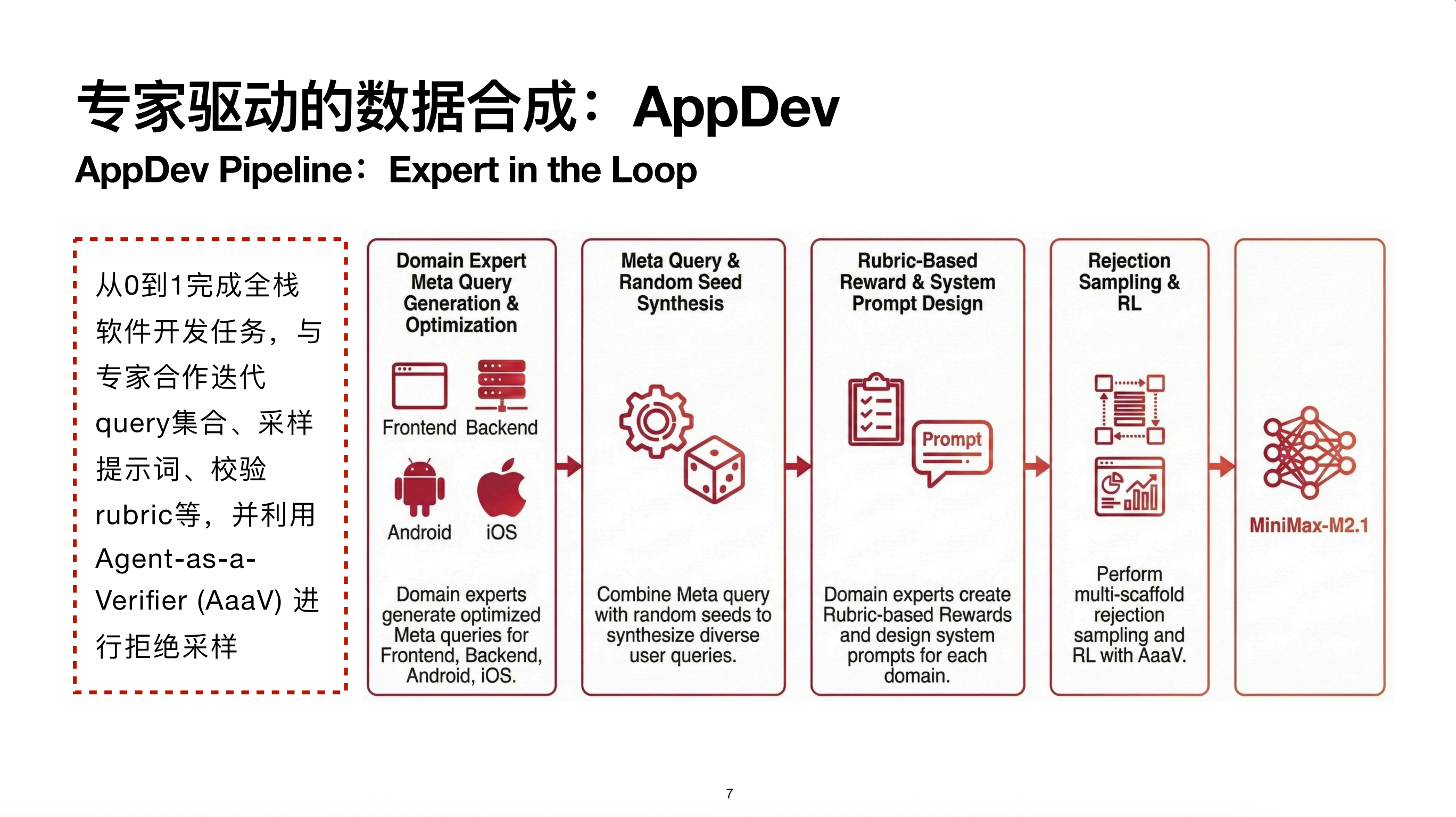 目前 M2.1 重点关注前端、后端、安卓和 iOS。公司内相关场景的专业研发同学会作为数据专家加入,帮我们优化 APPDev 的数据合成。