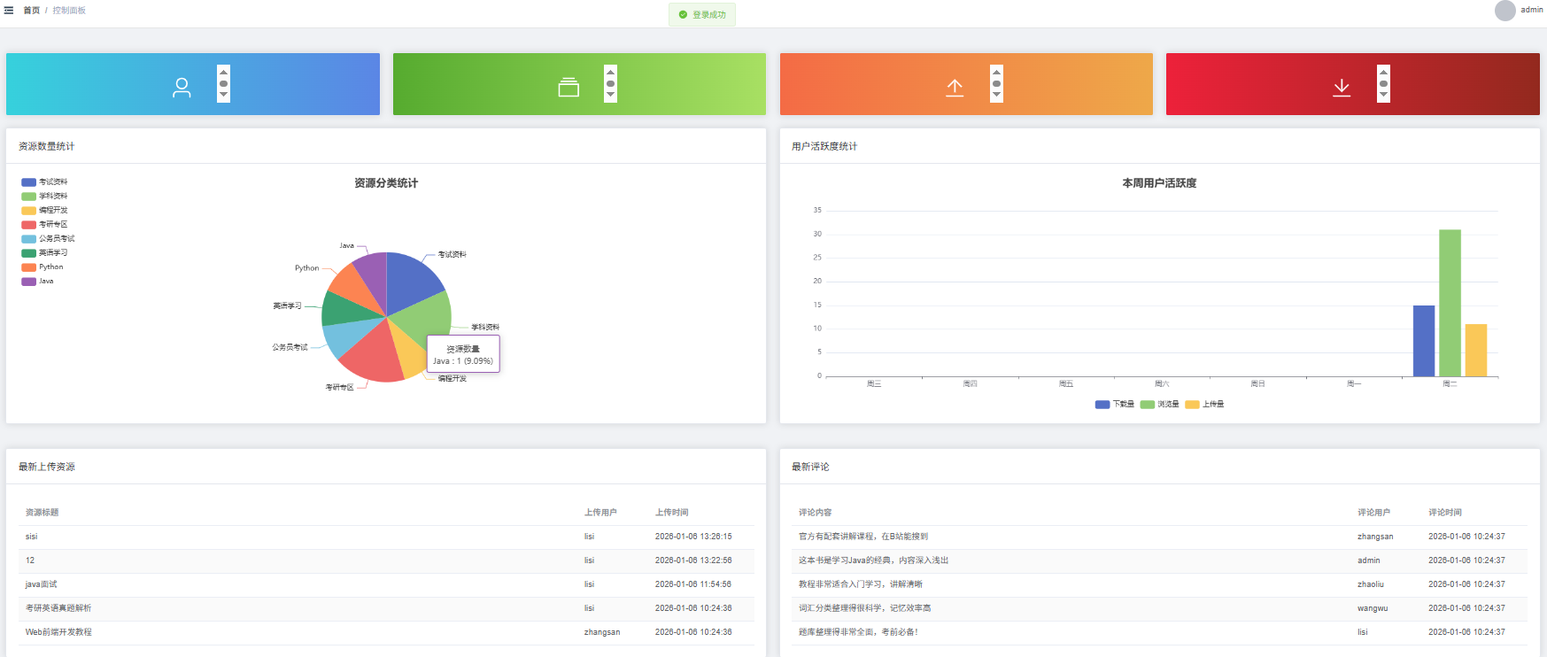 第四,完善数据统计功能。可以开发管理员数据看板,提供用户增长、资源上传、下载统计等多维度的数据图表。可以实现数据导出功能,支持导出Excel、CSV等格式的统计数据。可以增加实时数据监控,及时发现系统异常和性能问题。