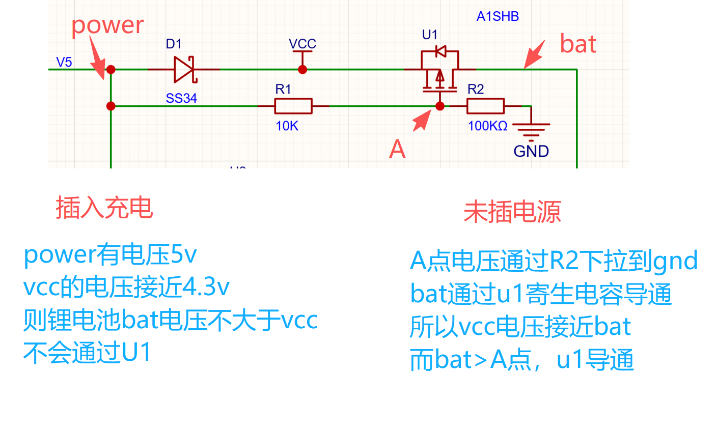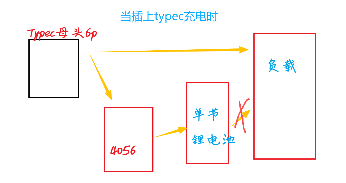 插入充电时,电池不在为负载提供能量,毕竟边充边放电是很慢的,尤其这个芯片充电电流太小。而且很多时候,当电池没电一般还是在使用时,也不方便打断工作去专门充电。当拔下充电线时,又能够转换为电池供电。(下面分析电路充放电切换电路)