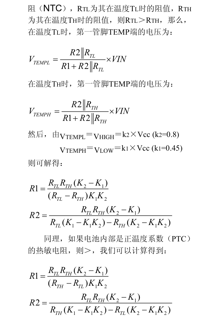 既然有了范围,根据下面计算公式,就能计算两个电阻的阻值,当然这需要设定电池充电的温度范围。这大概也是一些电子产品低温无法充电的原因吧(个人遇到苹果mini充电时无法充的情况)。