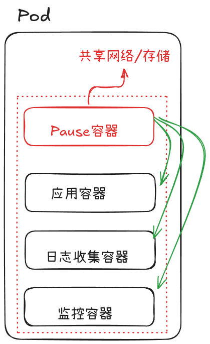- 每个 Pod 中均包含特殊的 Pause 容器,它负责提供 Linux 命名空间基础,使所有容器共享同一网络和存储命名空间。镜像路径通常为: