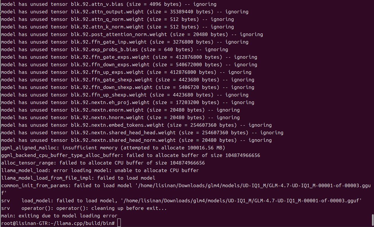 ./llama-cli -m /home/lisinan/Downloads/glm4/models/UD-IQ1_M/GLM-4.7-UD-IQ1_M-00001-of-00003.gguf -n 1024 -t 16 -c 1024