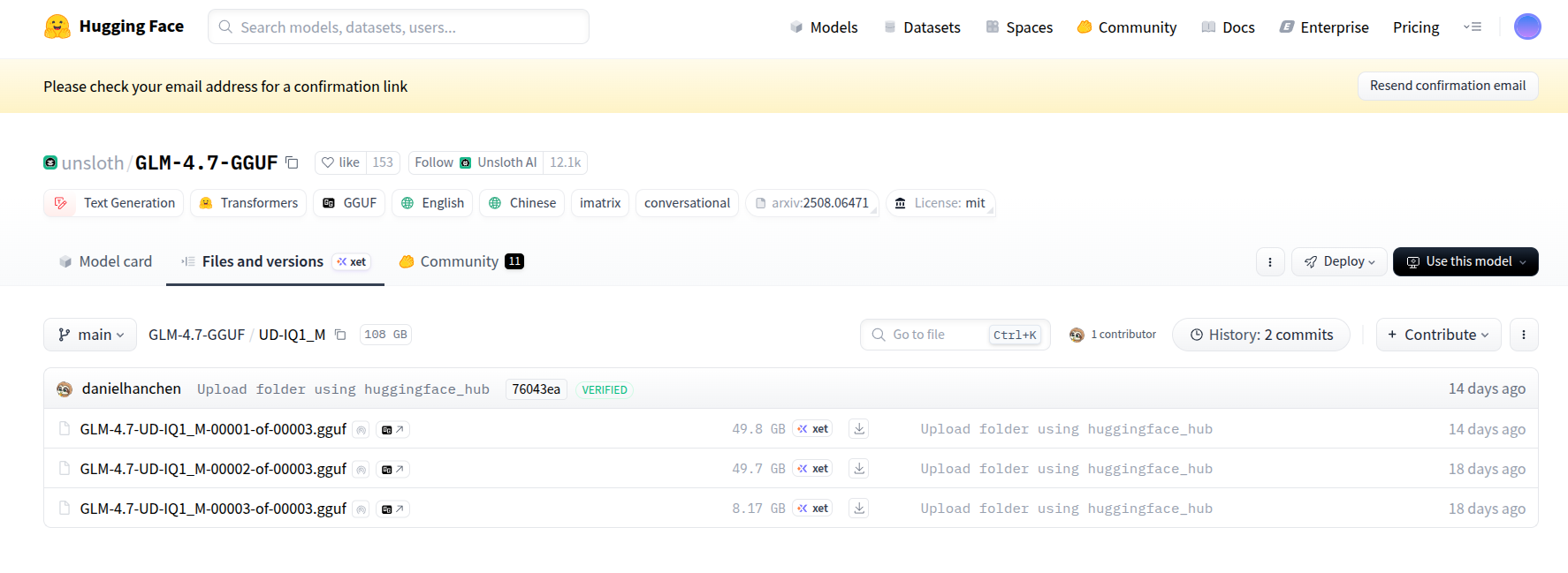 网址:https://huggingface.co/unsloth/GLM-4.7-GGUF/tree/main/UD-IQ1_M