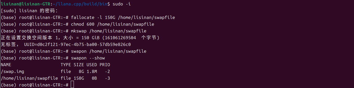 fallocate -l 150G /home/lisinan/swapfile #创建 150GB 交换文件