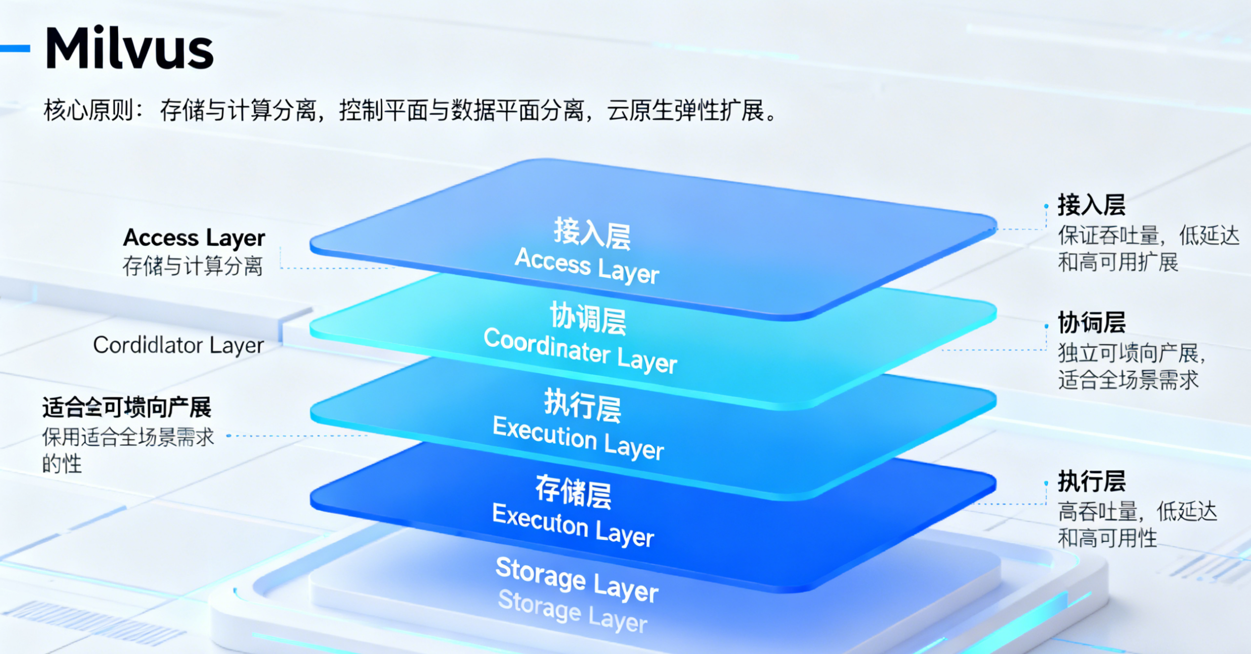 Milvus 的架构设计遵循三大核心原则:存储与计算分离 、控制平面与数据平面分离 、云原生弹性扩展。这种设计使其能够适配从单机开发到集群部署的全场景需求,同时保证高吞吐量、低延迟和高可用性。