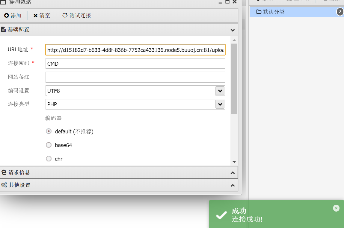 然后使用蚁剑连接:域名+upload/。。。/index.php,随后就可以进入和后台查看flag了