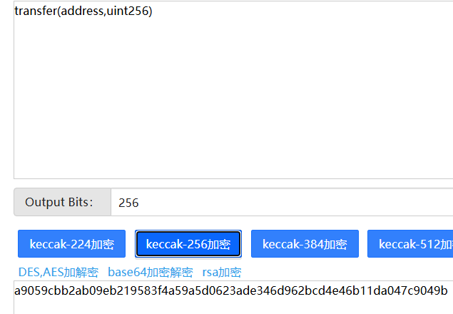 合约方法:transfer(address,uint256)。keccak256编码函数transfer(address,uint256),取前四字节a9059cbb