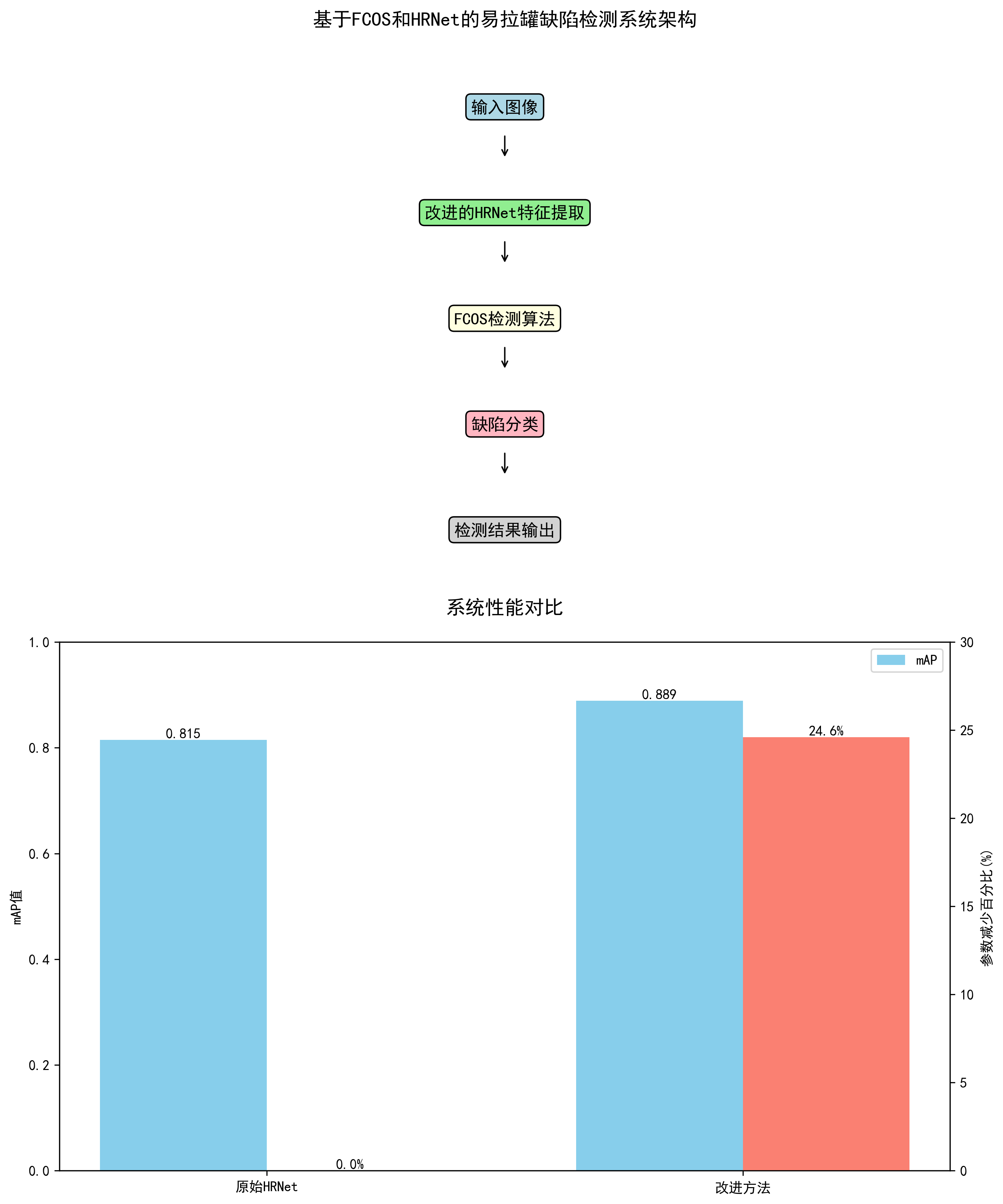 本文提出了一种基于FCOS和HRNet的易拉罐缺陷检测与分类系统,通过改进特征提取网络和检测算法,显著提高了检测精度和效率。实验结果表明,我们的方法在mAP上达到0.889,比原始HRNet提高了9.1%,同时参数量减少了24.6%,更适合工业部署。