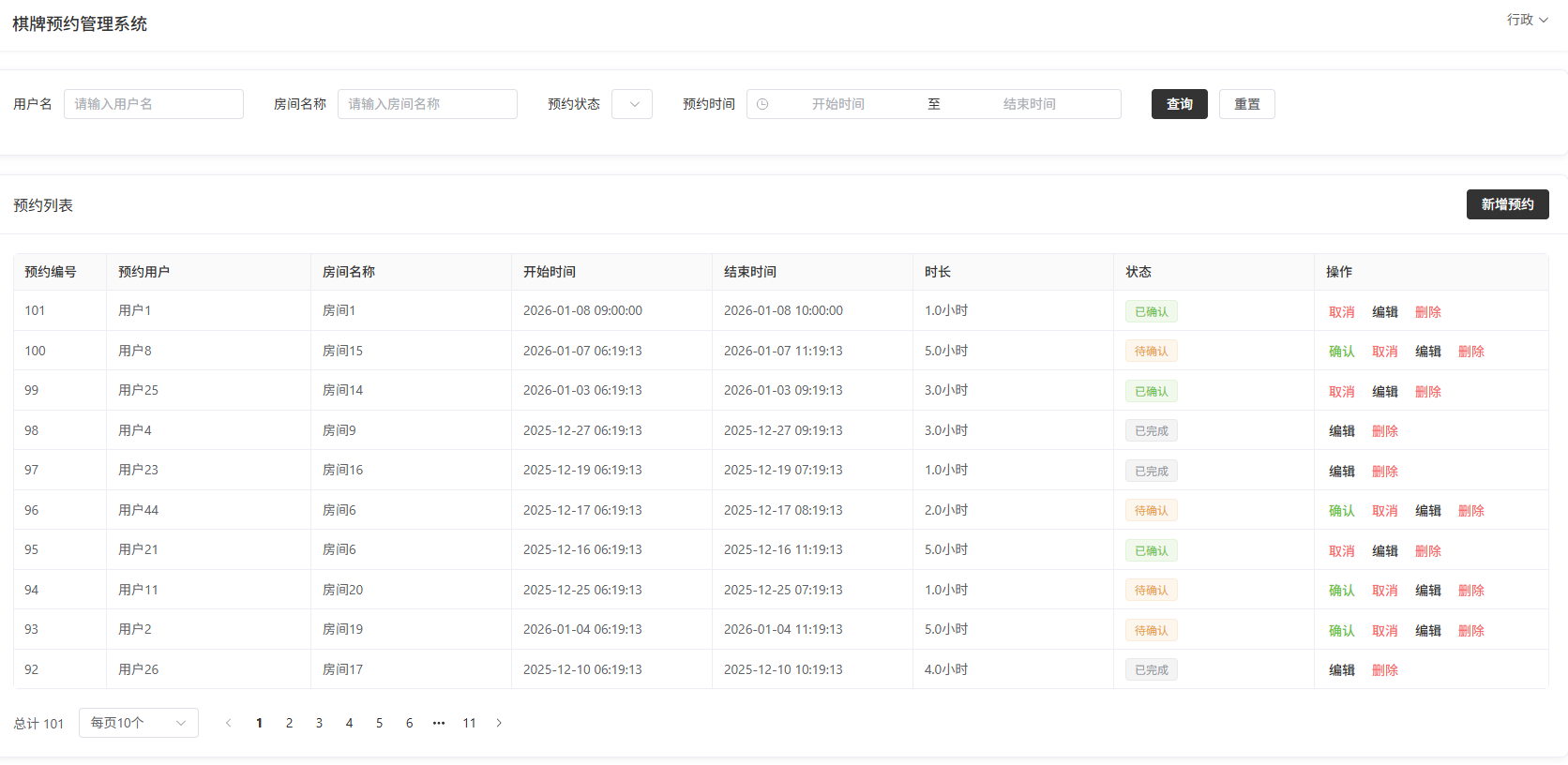预约管理页面供管理员查看和管理所有用户的预约记录,支持全员预约查询(查看所有用户的预约记录)、多条件筛选(按用户、房间、状态、日期筛选)、预约确认(管理员确认用户预约)、预约取消(管理员可以帮助用户取消预约)。列表展示预约ID、用户信息、房间信息、预约时间、状态等字段,支持分页浏览。