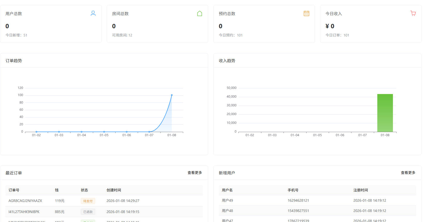 数据统计仪表盘是管理员登录后的首页,展示平台的整体运营数据,包括统计卡片(显示用户总数、房间总数、预约总数、今日收入)、订单趋势图(使用ECharts折线图展示近7天订单数量趋势)、收入趋势图(使用ECharts折线图展示近7天收入趋势)、最近订单列表(展示最新的5条订单记录)、新增用户列表(展示最新注册的5个用户)。仪表盘页面帮助管理员快速了解平台运营状况并提供数据决策支持。