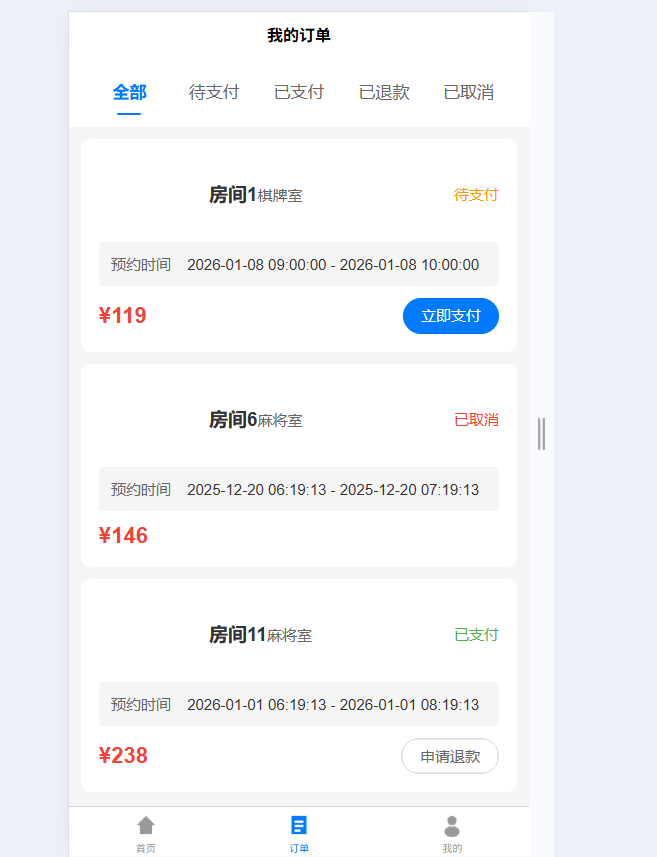 订单管理页面展示用户的所有订单记录,包含订单列表(显示订单编号、棋牌室、金额、状态等信息)、支付功能(对未支付订单进行支付)、退款申请(对已支付订单申请退款)、订单详情(查看订单的完整信息)。