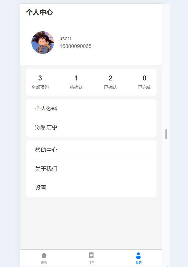 个人中心页面展示用户的个人信息和功能入口,包含用户信息卡片(头像、用户名、手机号)、统计数据(预约次数、订单数量、消费金额)、功能菜单(个人资料编辑、修改密码、退出登录)。