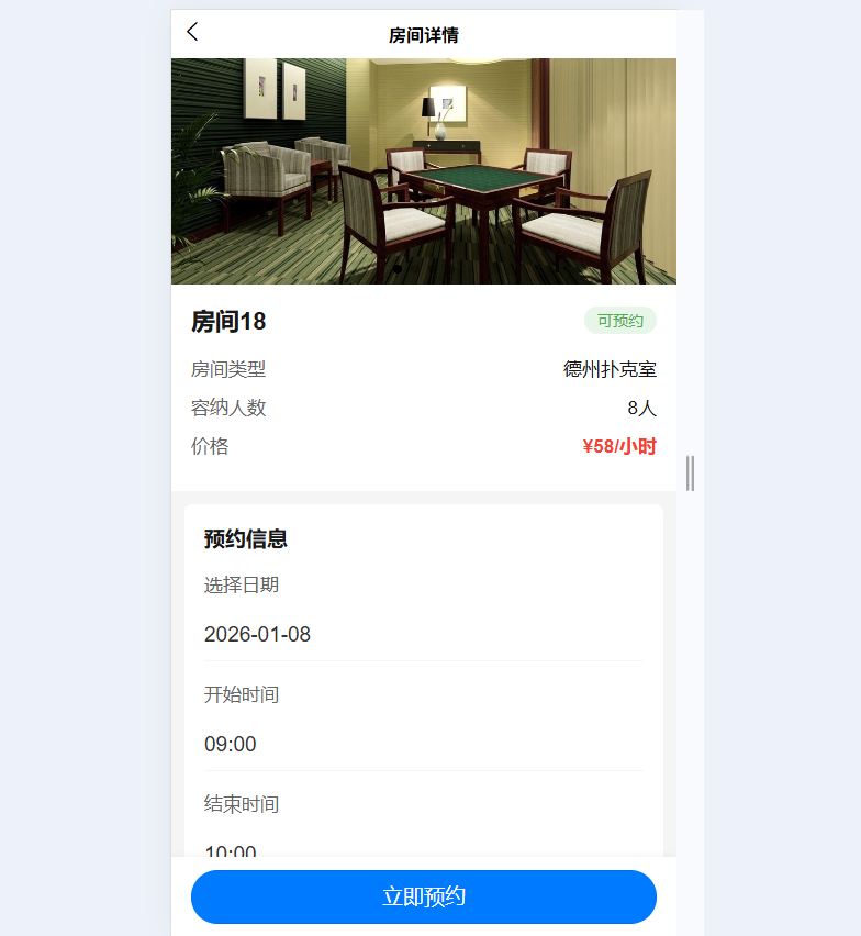 棋牌室详情页面展示棋牌室的完整信息,包含棋牌室基本信息(名称、类型、容纳人数、每小时价格、当前状态)、时间段选择(用户可以选择预约的开始时间和结束时间)、价格计算(根据选择的时间段自动计算总价格)、预约按钮(确认预约信息后提交预约)。