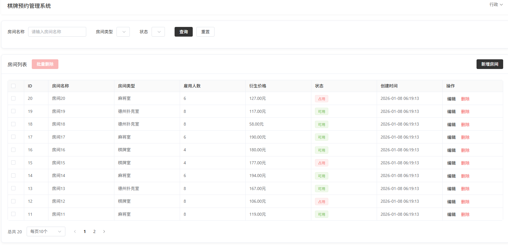 棋牌室管理页面是后台管理的核心功能页面,供管理员管理平台棋牌室。页面以棋牌室列表为主,支持按房间名称、类型、状态筛选,提供新增棋牌室(填写房间基本信息、设置价格)、编辑棋牌室(修改房间信息)、删除棋牌室、状态管理(设置房间为可用/占用状态)等操作。棋牌室表单包含房间名称、类型、容纳人数、每小时价格、状态等字段。