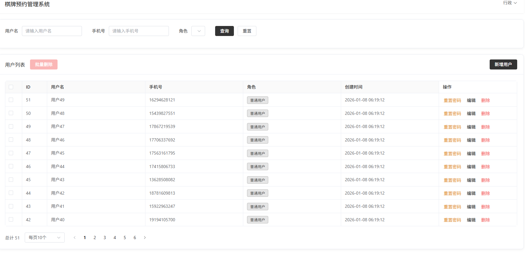 用户管理页面实现了完整的CRUD操作,支持单个操作和批量操作。表单验证确保用户名唯一性和手机号格式正确性。密码重置功能仅对普通用户开放,管理员密码需要通过其他方式修改。