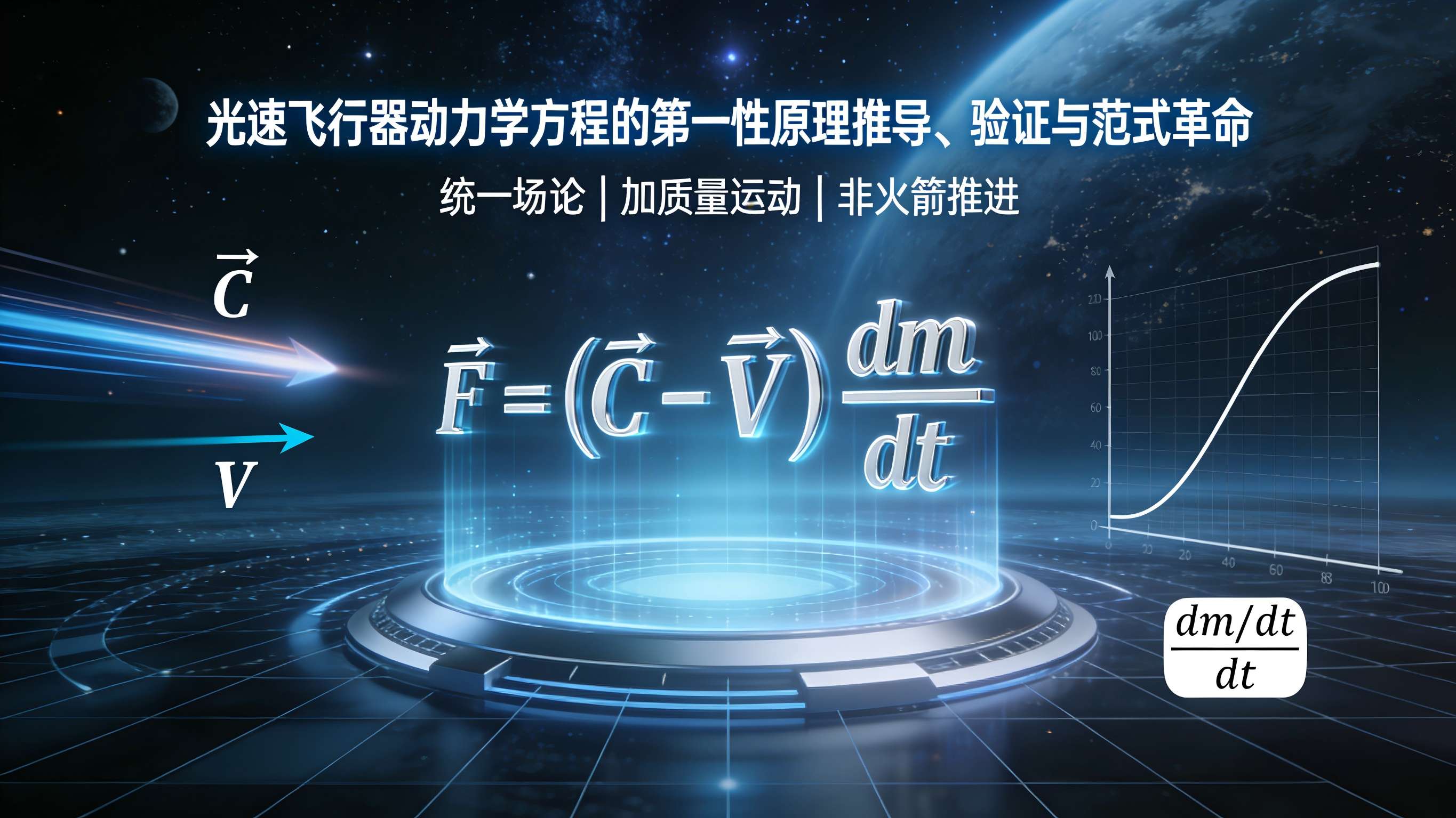 本文在张祥前统一场论的完备框架内,首次完成了对革命性推进概念------"加质量运动"或"质量变化推进"------的核心动力学方程 F⃗=(C⃗−V⃗)dmdt\vec{F} = (\vec{C} - \vec{V})\frac{dm}{dt}F =(C −V )dtdm 的严格数学推导与全面物理验证。该方程宣告了一种超越传统反作用推进(火箭方程)的全新范式:推进力并非源于动量交换,而是源于飞行器自身运动质量 mmm 的变化率与空间本底光速运动矢量 C⃗\vec{C}C 及其自身速度 V⃗\vec{V}V 之矢量差的乘积。论文从该理论的两大基石------时空同一化 (R⃗=C⃗t)(\vec{R}=\vec{C}t)(R =C t) 与动量几何化 (P⃗=m(C⃗−V⃗))(\vec{P}=m(\vec{C}-\vec{V}))(P =m(C −V )) ------出发,结合力的普适定义 F⃗=dP⃗dt\vec{F}=\frac{d\vec{P}}{dt}F =dtdP ,通过严谨的矢量微积分求导,在"人工场扫描"实现可控质量变化 (dm/dt≠0)(dm/dt \neq 0)(dm/dt=0) 且忽略空间光速方向剧烈变化 (dC⃗dt≈0)(\frac{d\vec{C}}{dt} \approx 0)(dtdC ≈0) 与传统加速度 (dV⃗dt≈0)(\frac{d\vec{V}}{dt} \approx 0)(dtdV ≈0) 的特定技术场景下,自然简化为目标方程。量纲分析证实方程左右量纲均为力 [MLT−2][MLT^{-2}][MLT−2],形式自洽。数学与物理自洽性验证表明,该方程与理论内部的完整力方程、能量方程及"加质量运动"原理完全兼容,并能平滑退化至经典变质量系统动力学形式。物理诠释揭示,该方程描述的推力方向由 (C⃗−V⃗)(\vec{C}-\vec{V})(C −V ) 主导,其大小正比于质量变化率,为实现"不依赖工质喷射"的推进以及通过使静止质量 m0o0m_0 o 0m0o0 而趋近光速的"加质量运动"提供了严格的数学原理。本文论证表明,该方程不仅是数学上自洽的理论推论,更在物理上指向了一次深刻的推进技术范式革命,为未来光速飞行器的概念设计奠定了核心动力学基础。