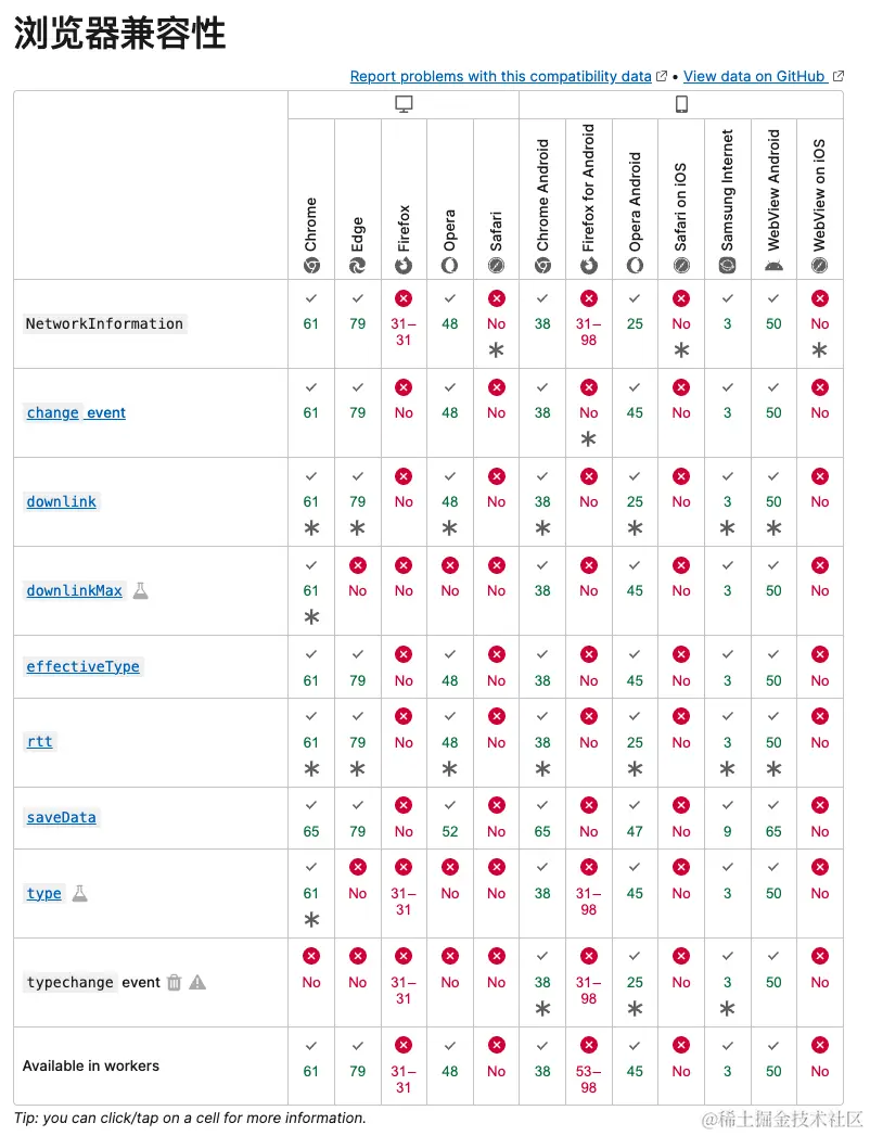 其中,我们可以通过effectiveType判断当前网络的大体情况,并且可以拿到一个预估的网络带宽(downlink)。我们可以通过监听onchange事件,在网络变差的时候,展示对应的弱网提示。