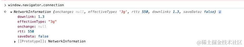 我们的应用是h5,这里我们可以使用window对象中的NetworkInformation(developer.mozilla.org/zh-CN/docs/...),我们可以通过浏览器的debug工具,打印window.naviagtor.connection,这个对象内部就存储着网络信息: