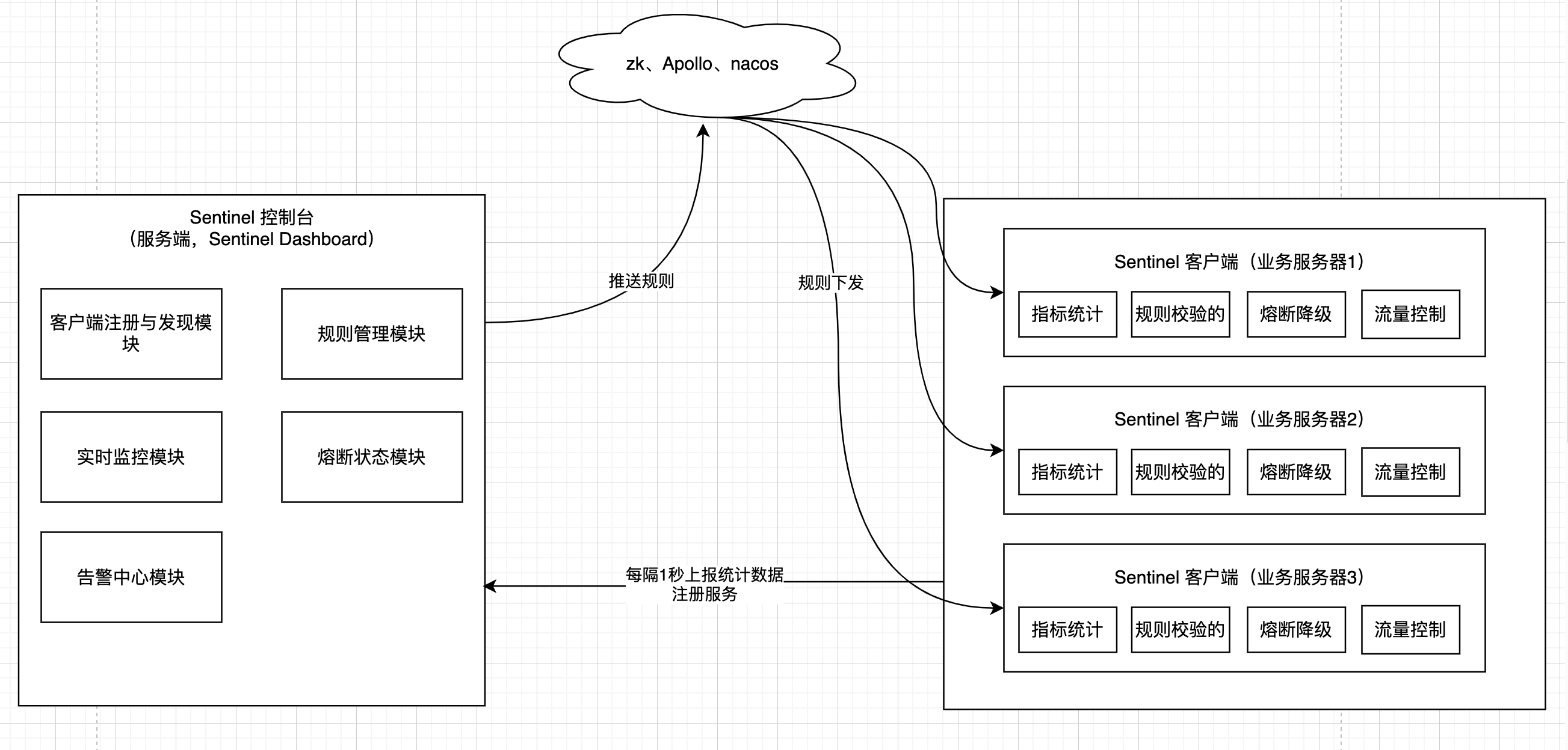 - Sentinel 控制台(服务端,Sentinel Dashboard) :管控端,纯可视化运维平台,无核心业务逻辑,仅负责规则配置、实时监控、流量大盘、告警推送、规则持久化等管控能力,属于「可选组件」。