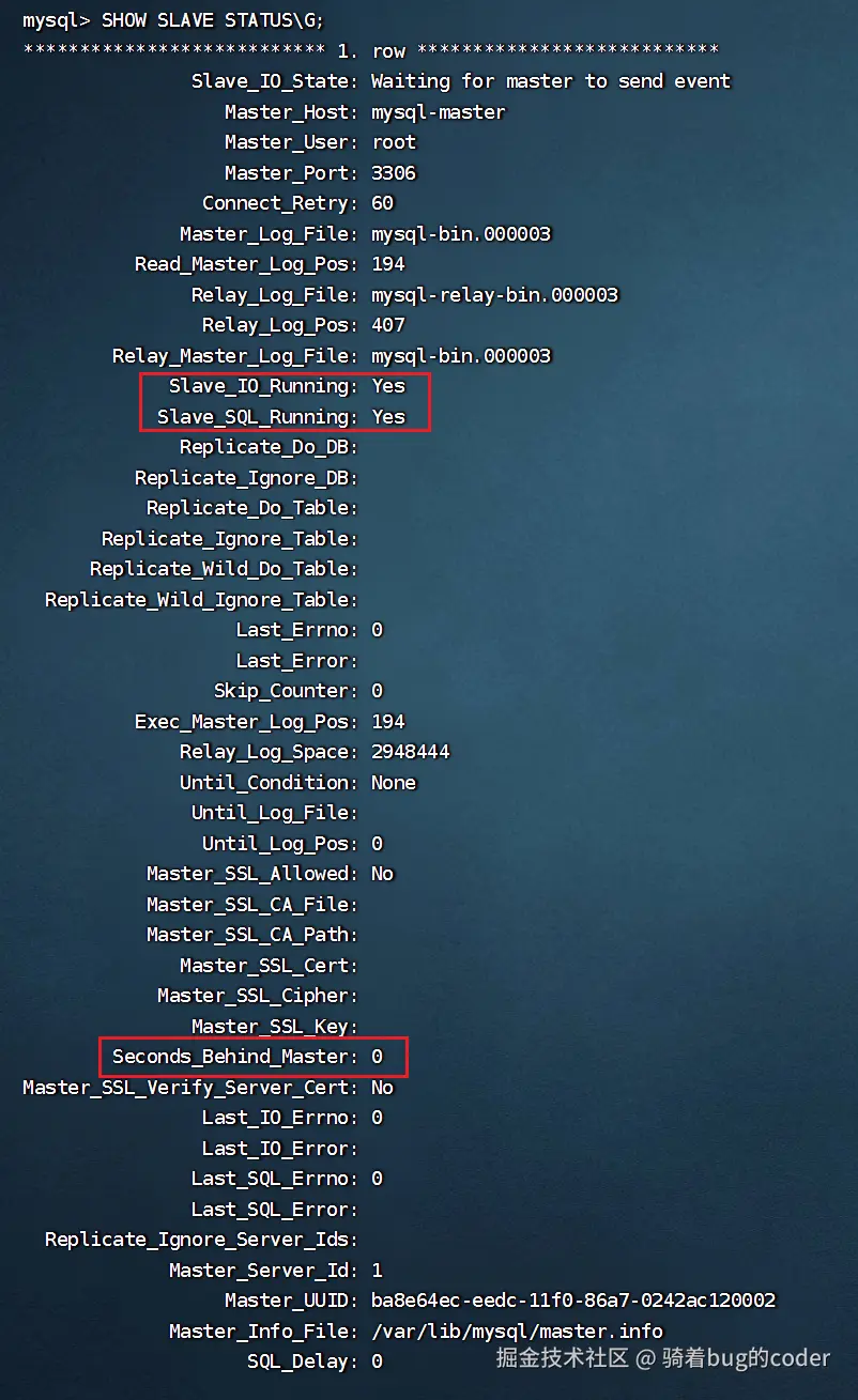 0:完美,主从完全同步。> 0:有延迟,数字就是落后的秒数(比如 60 代表从库正在回放主库 1 分钟前的操做)。NULL:出大事了,复制线程报错停止了(比如网络断了或SQL执行错了),需要立刻排查Last_Error。