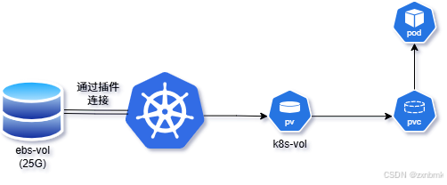 上图某存储管理员创建了名为ebs-vol的25GB的ebs物理卷,通过厂商的插件与Kubernetes连接,Kubernetes管理员也创建了一个名为k8s-vol的PV卷通过插件与真实的ebs卷建立连接(将外部存储映射到集群),这时候Pod通过向PVC申请对PV的使用。