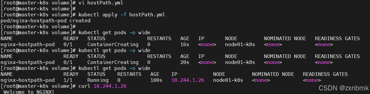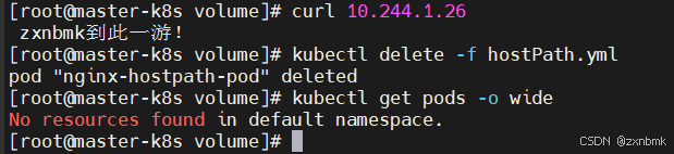 yamlapiVersion: v1 kind: Pod metadata: name: nginx-hostpath-pod spec: containers: - name: nginx-container image: nginx volumeMounts: - mountPath: /usr/share/nginx/html # nginx 的 Web 根目录 name: hostpath-volume # 卷的名称 volumes: - name: hostpath-volume hostPath: path: /mnt/data # 宿主机上挂载的目录路径 type: Directory # 类型为 Directory,指示这是一个目录可以看见,curl后显示了
