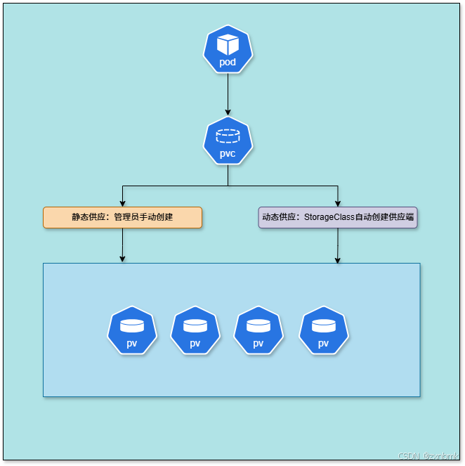 上面我详细讲解了创建pvc绑定pv从而使用pv的资源,整个过程来说,如果有多个pod想要使用我们的pv,就要一直创建pv,显得很繁琐,所以,这里出现了存储类(StorageClass),他就是用来动态管理我们的pv的我们称为动态供应,而上一节我们手动创建pv的过程就属于静态供应具体如下图: