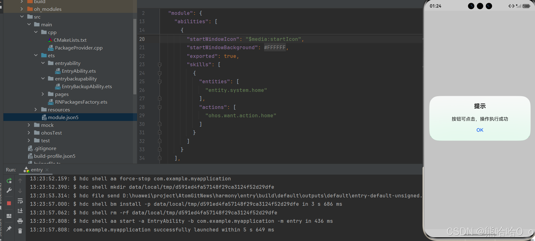 - ✔ TouchableOpacity 核心能力:点击逻辑 + 原生触摸反馈,组件会在被按压时自动改变自身透明度,松开后恢复原状,给用户清晰的视觉交互感知,这是鸿蒙应用的标准交互体验。