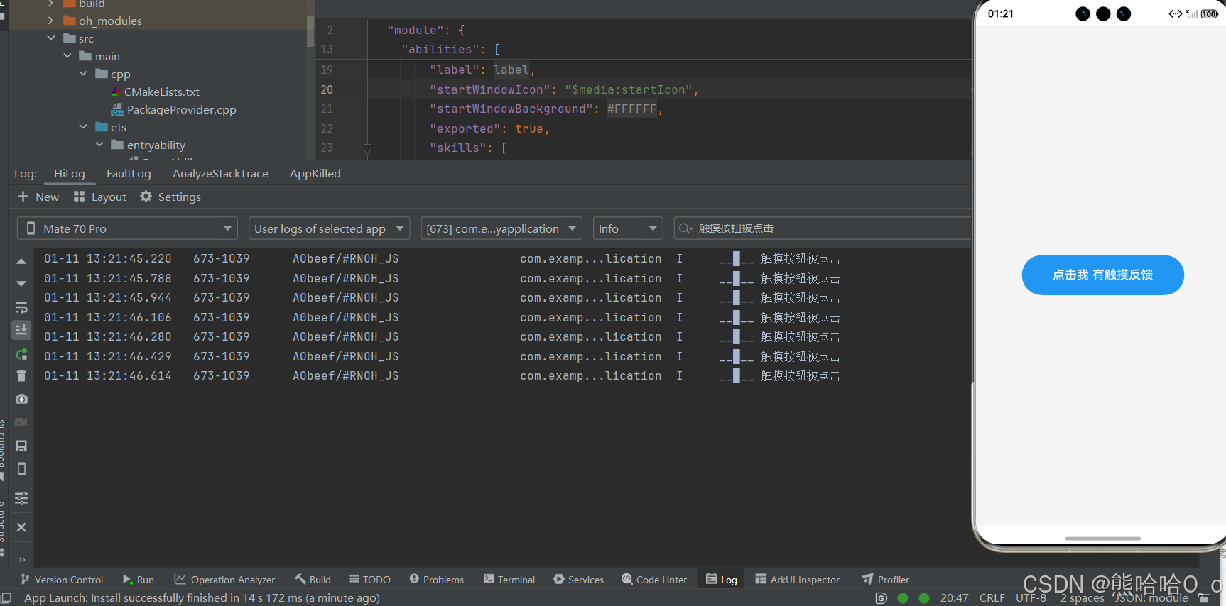 最基础的核心用法,也是开发中最常用的「按钮式交互」,完美展示 TouchableOpacity 的核心能力:点击反馈 + 点击事件,代码极简,是所有触摸交互的基础模板,适配所有鸿蒙设备。