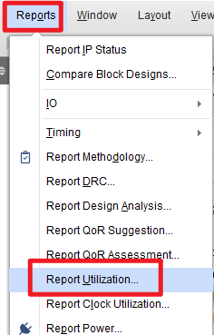 完成综合后点击左上角Reports-Report Utilization即可查看资源消耗情况或者在左侧的Flow Navigator中Open Implemented Design中的Report Utilization。