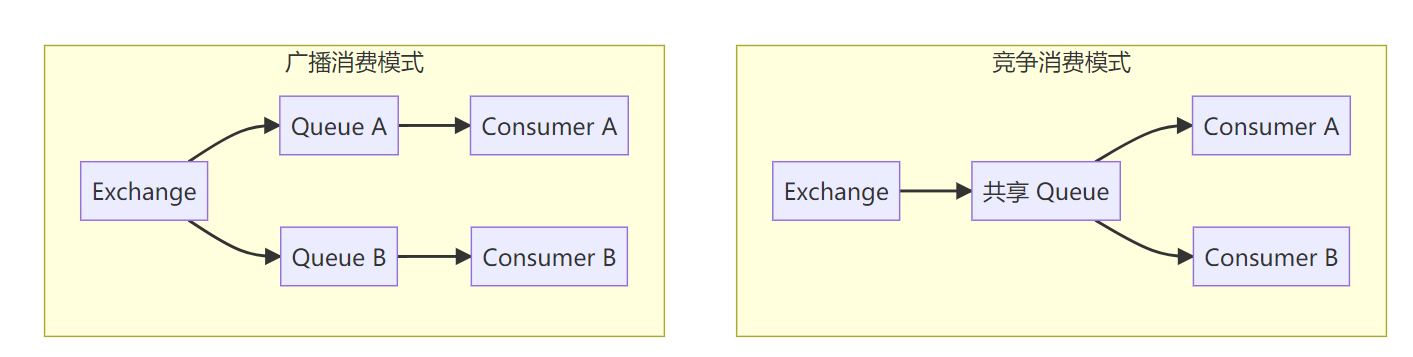 | 竞争消费 | 多消费者共享同一 Queue | 任意 | 任务分发、负载均衡 |