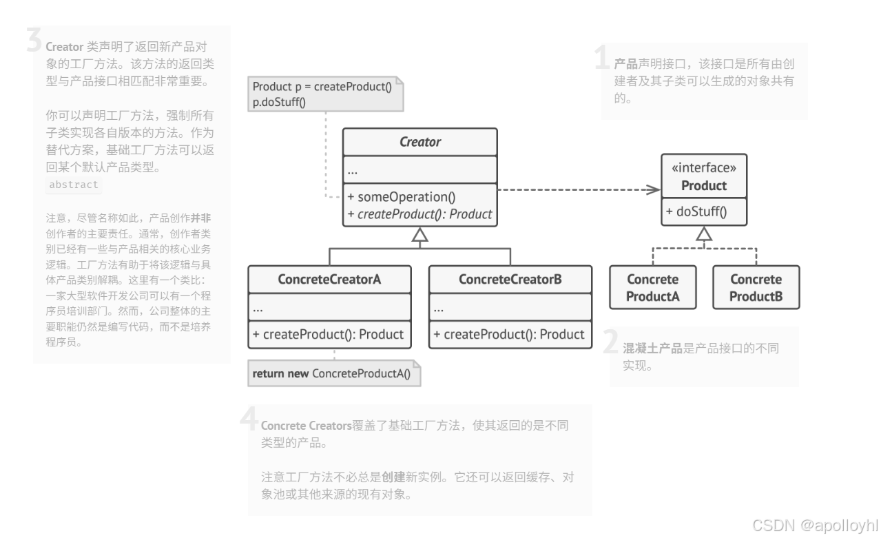 工厂方法模式建议你用作符替代直接对象构造调用,而调用一个特殊的工厂 方法。别担心:对象仍然是通过作符创建的,但调用是在工厂方法内部。通过工厂方法返回的对象通常被称为产品。