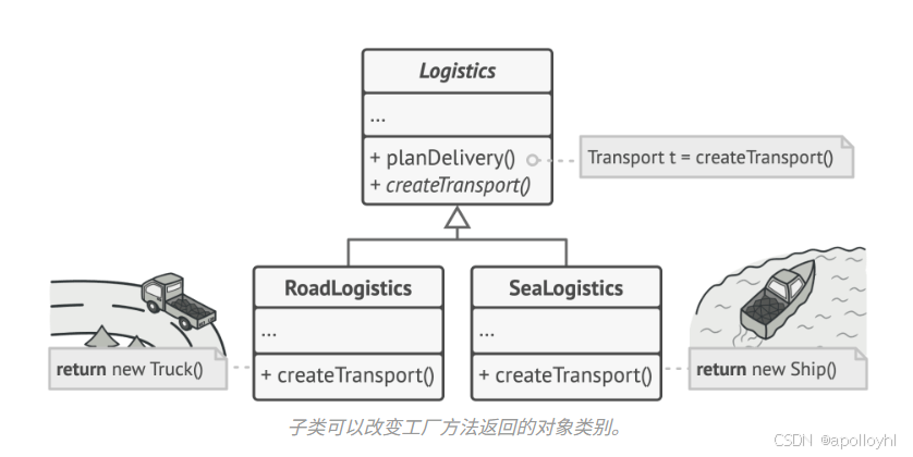 使用工厂方法的代码(通常称为客户端代码)看不到不同子类返回的实际产品之间的区别。客户将所有产品视为抽象的。客户端知道所有传输对象都应该有该方法,但具体如何工作对客户端来说并不重要。