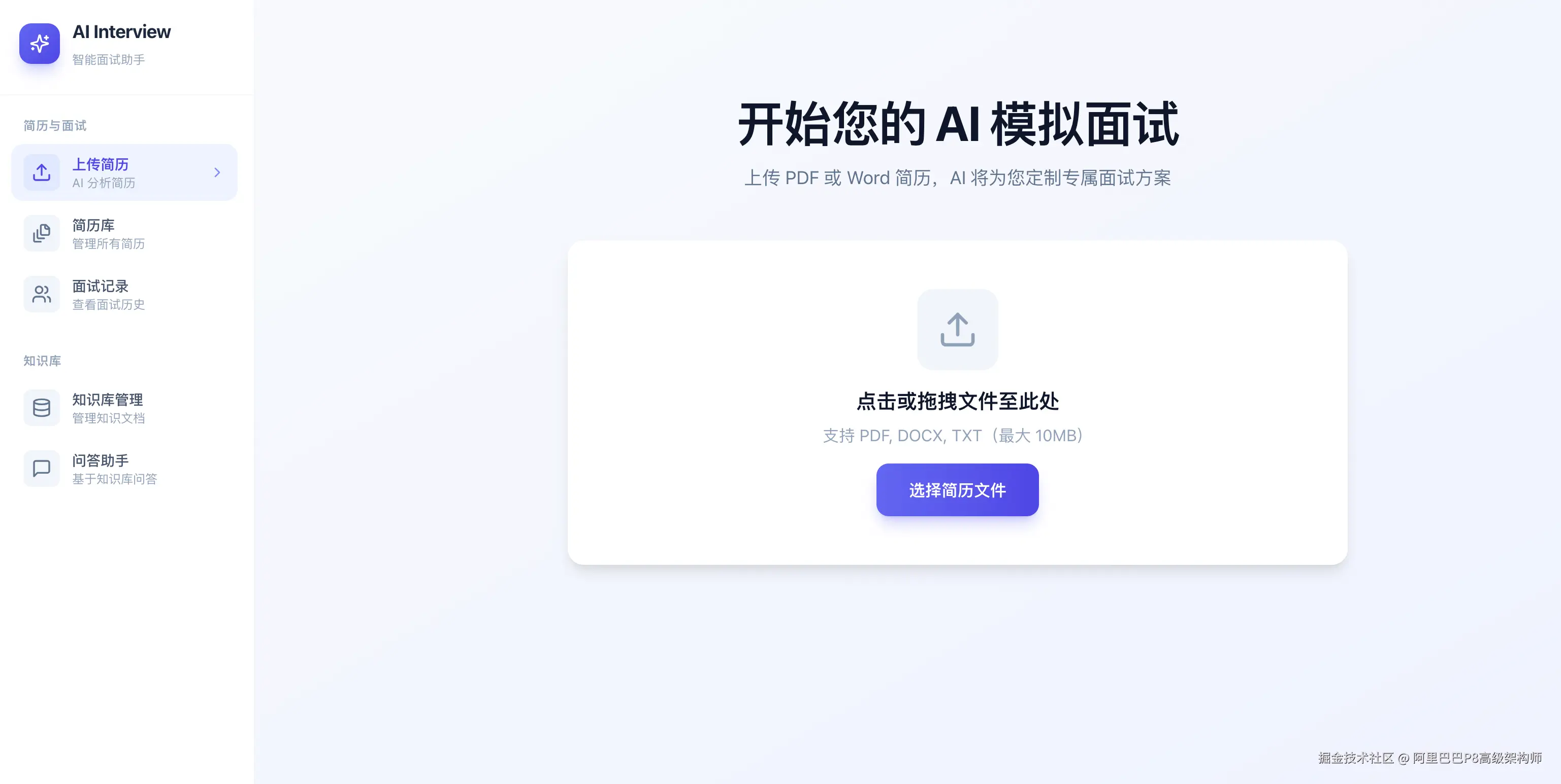 - 简历管理:上传PDF/DOCX等格式简历,系统自动解析内容并生成包含评分、优劣势分析和改进建议的详细报告。