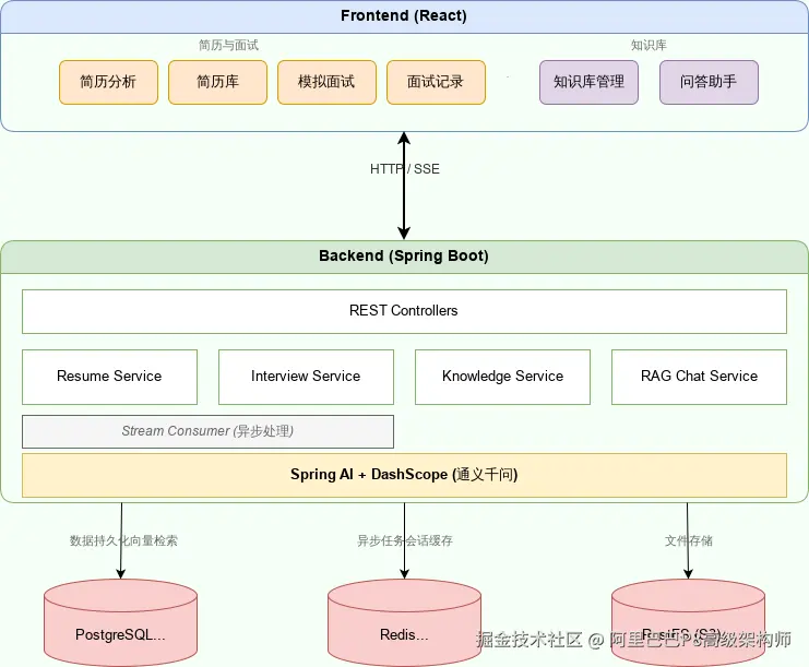 - PostgreSQL + pgvector :传统的关系型数据存储业务信息(用户、简历、面试记录等),而