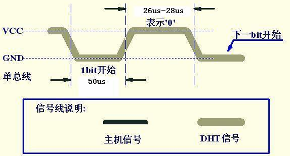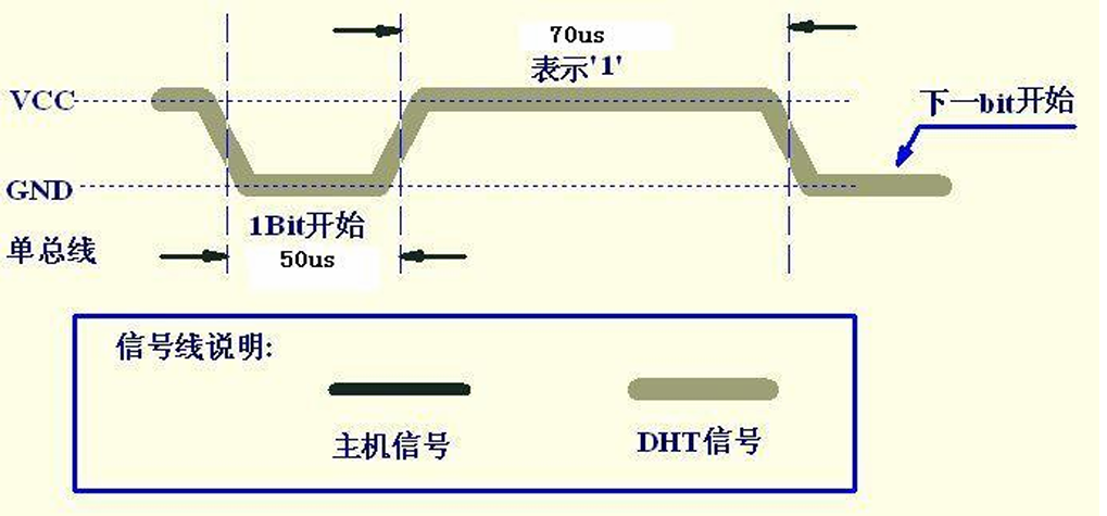 - 当最后一bit数据传送完毕后,DHT11拉低总线50us,随后总线由上拉电阻拉高进入空闲状态。