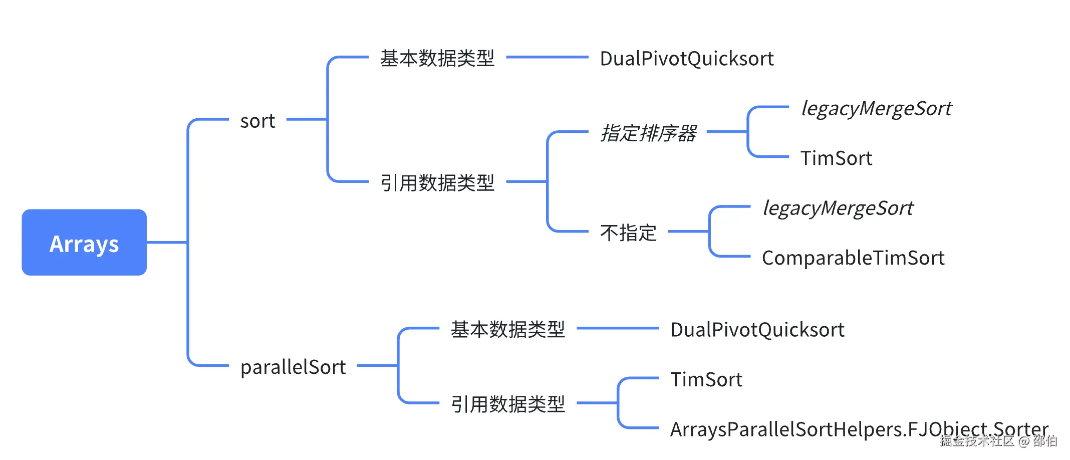 通过阅读 JDK 源码(以 JDK 21 为例),可发现 Arrays 的排序方法会根据数据类型选择不同的底层算法,具体实现如下: