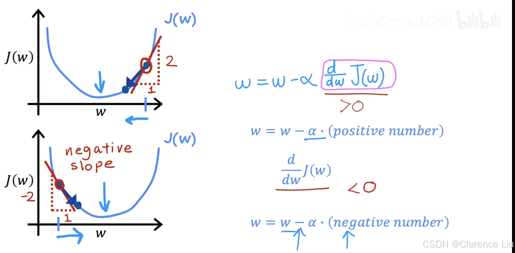 - 下面对一个单参数 w w w的代价函数 J ( w ) J(w) J(w)进行分析,以便于更好的理解梯度下降的正确性。当初始位置位于极小值右侧,因为这点处的切线斜率是一个正数,同时 α \alpha α为正数,所以梯度下降寻找 w w w的过程是一个让 w w w减小的过程;反之,是使得 w w w增大的过程